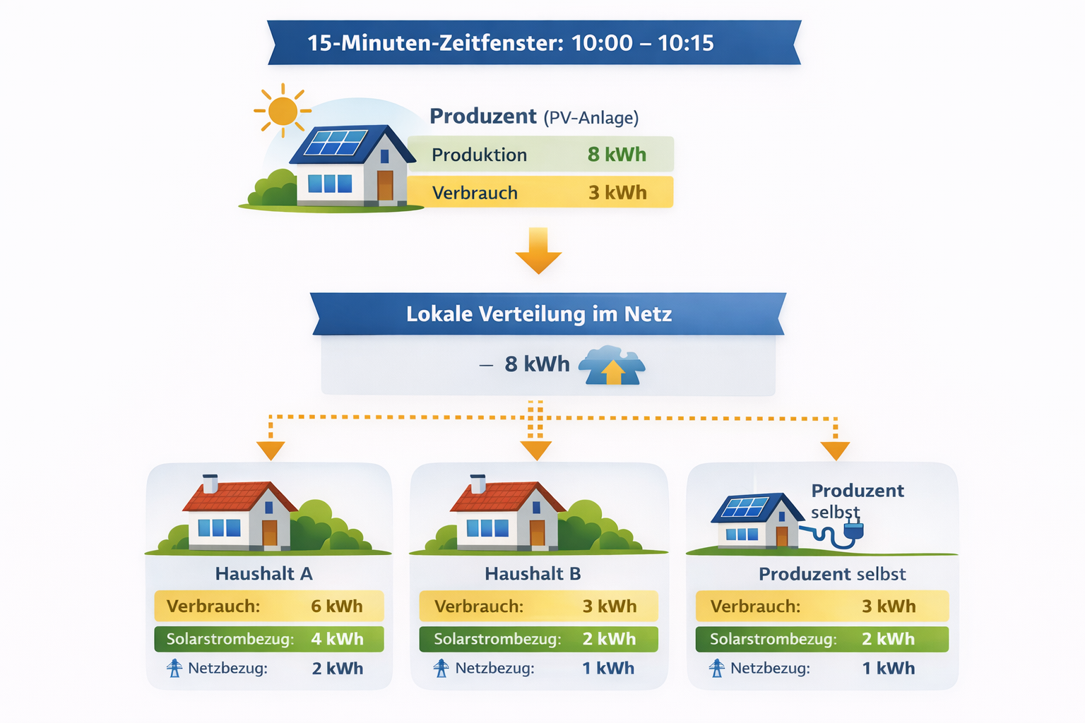 Der eingespeiste Solarstrom wird in dieser Viertelstunde auf alle Verbraucher im Netz verteilt. Dazu gehören auch Sie selbst – wenn Sie in diesem Zeitraum Strom verbraucht haben.