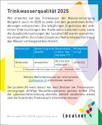 Trinkwasserqualität 2025 Wie erwartet hat das Trinkwasser der Wasserversorgung Burgdorf auch im 2025 zu jeder Zeit den gesetzlichen Anfor derungen entsprochen. Die letzjährigen Ergebnisse der amt…