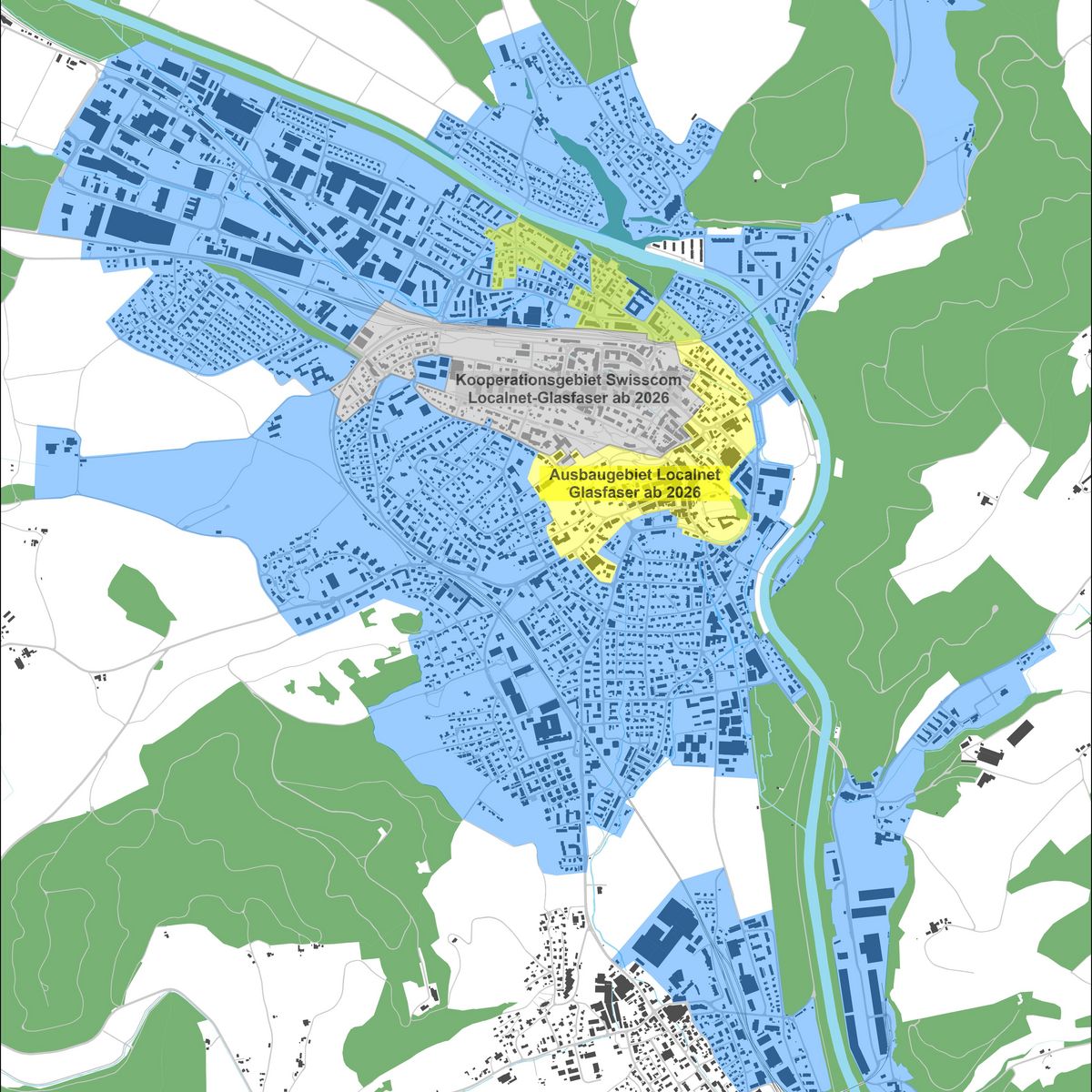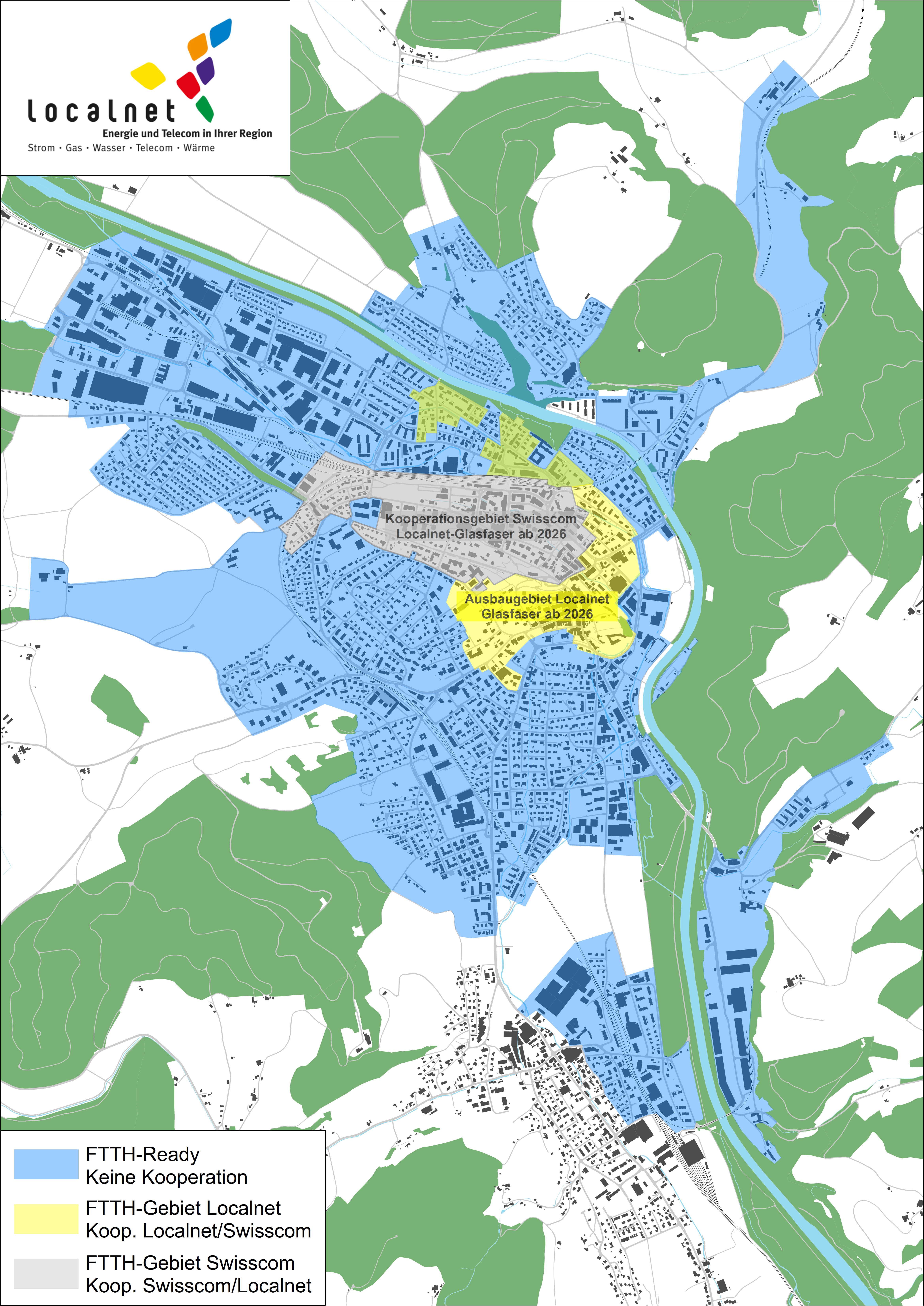 Anders als bei anderen Anbietern geht die schnelle Technologie dabei bis in die Wohnung der Kundinnen und Kunden. Man spricht von Fiber to the Home (FTTH). Die Arbeiten sollen voraussichtlich bis 2026 abgeschlossen sein. Wo die modernste aller Technologien bereits verfügbar ist, und welche Gebiete auch in Zukunft davon profitieren können, zeigt der abgebildete Plan.