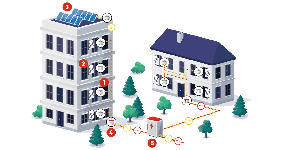 1) Smart-Meter, 2) Stromrechnung Endverbraucher, 3) PV-Anlage, 4) Hausanschluss, 5) Verknüpfungspunkt, z.B. VK